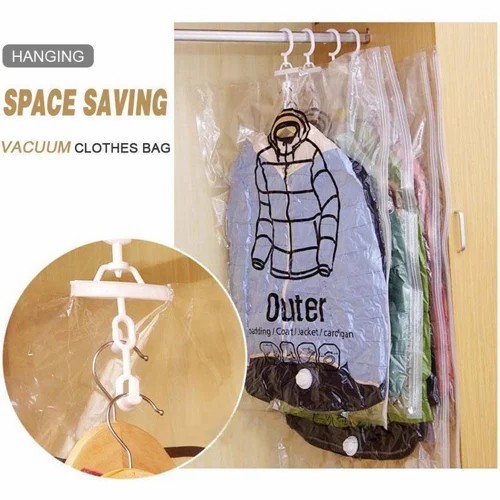 Keep Clothes Flat and Clean:Closet organizer uses a waterproof and dust-proof design, which helps to keep clothes flat and clean. Save 80% Space:Space Saver Bags can efficiently organize your wardrobe and your room. It is very suitable for household storage and can save 80% of space. Easy to Use:Closet organizers and storage are designed with an exhaust valve, you can use a vacuum cleaner for quick exhaust, which is very convenient and a must-have at home. This is a hangable closet clothing compression bag. Made of high quality PE+PET. Compact valve, side pull suspension design, easy to use. Can be used for compression storage down jackets, coats. Two-way shackle, double-sided suspension, can hang two pieces of clothing at the same time. Can save wardrobe space. Large capacity, not only suitable for travel, but also suitable for home. Give you a relaxing trip and a clean home. Size: medium 67*90cm, large 67*110cm; Weight: 150g; Material: PE+PET; Color: transparent; Side pull hanging compression bag; Storing down jackets, coats, etc. Package Included: 1*compression bag; 1*hanger hook; 1*Manual air pump.